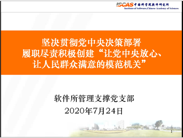 支部党员大会上,支部书记谢京红为支部党员作题为“坚决贯彻党中央决策部署履职尽责积极创建‘让党中央放心、让人民群众满意的模范机关’”的专题党课报告。带领大家学习了习近平总书记在中央和国家机关党的建设工作会议讲话和白春礼院长《强化政治机关意识,走好第一方阵,切实履行国家战略科技力量职责使命》专题党课精神。并对软件所模范机关创建方案、“基层组织建设年”、“学思践悟,知行合一”诵读、“清风正气传家远”活动及疫情防控工作等支部近期重点工作进行了安排和部署。