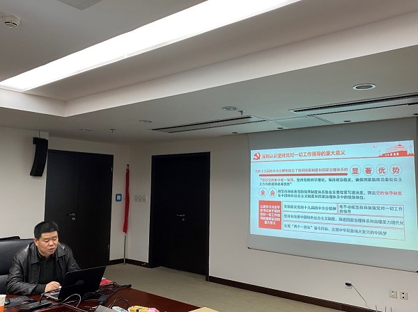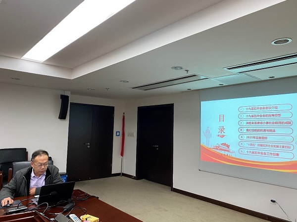 党委委员黄涛研究员领学中国共产党第十九届中央委员会第五次全体会议公报,带领大家深刻学习领会全会精神实质、丰富内涵和核心要义。党的十九届五中全会站在“两个一百年”奋斗目标的历史交汇点,擘画了发展蓝图、规划实践路径、作出战略部署,为夺取全面建设社会主义现代化国家新胜利注入强大思想和行动力量。