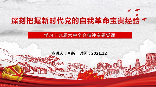 李衡作《深刻把握新时代党的自我革命宝贵经验-学习十九届六中全会精神》党课报告,从百年奋斗历程中汲取前行力量、深刻把握新时代党的自我革命宝贵经验、激浊扬清奔向伟大梦想等三个方面,带领与会党员深入领会党百年奋斗的伟大成就、伟大意义和伟大经验。他强调,我们的面前路途依然漫长,前程依然艰辛,在新征程上,我们必须铭记生于忧患、死于安乐,常怀远虑、居安思危,坚持全面从严治党,坚定不移推进党风廉政建设和反腐败斗争,不断清除一切损害党的先进性和纯洁性的因素,不断清除一切侵蚀党的健康肌体的病毒,确保党不变质、不变色、不变味,确保党在新时代坚持和发展中国特色社会主义的历史进程中始终成为坚强领导核心,紧密地团结在以习近平同志为核心的党中央周围,在实现第二个百年奋斗目标、实现中华民族伟大复兴的时代征程上再创新辉煌、再续新荣光!