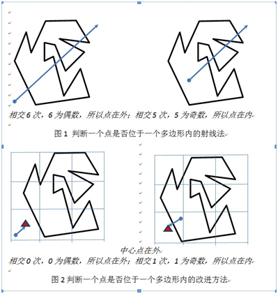 在计算机图形学中,关于“判断一个点是否位于一个多边形中”的问题有许多研究,提出了许多方法,供计算机实现以处理相关事情。一个基本的处理原则是:从这个点发出一条射线,统计这条射线与多边形的边界相交的次数;然后根据统计数的奇偶性进行判断。如果次数为偶数,就表示这个点在多边形外面,因为这条射线穿进多边形又穿出了,不停的穿进穿出,最后还是穿出了。同理,如果为奇数,就是这条射线穿进穿出多次后,最终穿进而不出来了,就表明该点在多边形内。如图1所示。
