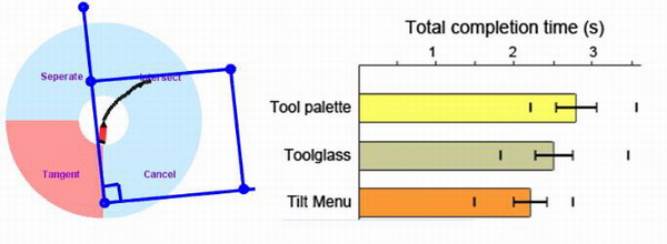 笔的操作主要靠手指和手腕运动,运动幅度一般较小,并且由于笔轻巧,适合小范围的曲线运动,因此用笔可以轻易地进行勾画,同时可以轻松完成各种Tilt,Pan等3D动作。正是利用了笔的这一特点,我们设计出一种不同于传统菜单模式的动态三维手势技术。该技术支持在Ink输入状态下,通过笔身3D动作实现其他各种交互处理,从而避免了Ink输入和命令输入的状态间频繁切换的问题。心理学实验表明,该项技术可显著减少用户在交互过程中的任务完成时间,降低错误率。
