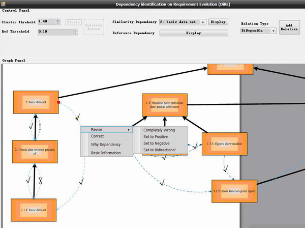 本成果是一种支持需求分析和管理的模型和工具,可以用来解决实际项目中,构建需求依赖关系困难,准确度较低,以及相应的预测和评估需求变更影响等问题。本成果在需求相关性研究的基础上,在对大量实际项目的需求规约的多个版本进行分析之后,发现需求的变更会导致一些需求发生联动变更从而使得整个需求规约不存在互相矛盾的地方。根据这个规律,我们分析了发生联动变更的需求与变更的需求在文本描述上的特点,定义出两种影响需求变更决策的依赖关系类型,这两种依赖关系分别是相似依赖关系和引用依赖关系。相似依赖关系是对两个需求在某一个概念上有相同或相似的描述的刻画,如果其中一个需求发生变化,将会导致另外一个需求发生变化,需求相似依赖是基于需求修改导致不一致的场景;引用依赖关系在需求标题与需求内容在文本上的相似性进行了刻画,如果其中标题相似的需求被删除,将会另外一个需求发生变化,需求引用依赖是基于需求删除导致不一致的场景。根据这些关系的特点,基于信息检索(IR)技术,包括相似度计算,距离计算,聚类等,开发出了工具进行自动化和半自动化的识别,极大的提高了识别需求依赖关系的准确度,同时降低了人力成本消耗,为进一步准确、快捷的进行需求变更影响分析提供了条件。