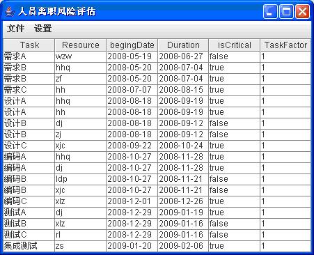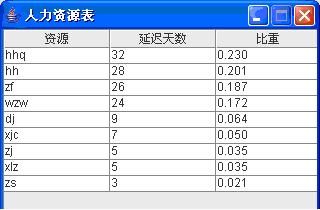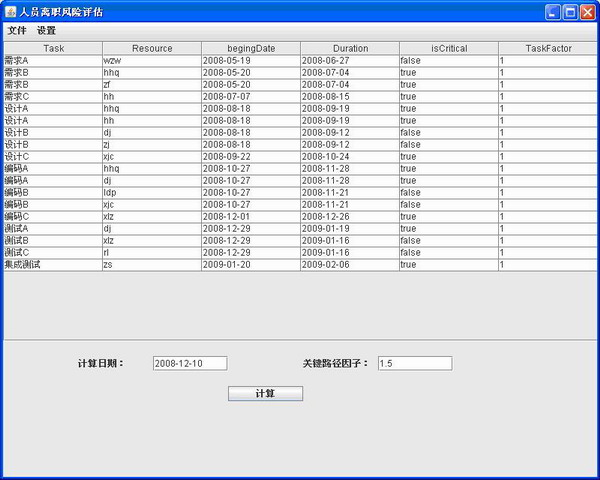 本工具将人力资源风险管理的粒度细化到具体的一个项目上,根据项目计划中反映的项目特征,结合项目中的人力资源的一些参数数据,来量化每个人离职后对他所参与的任务的影响,根据人力资源的学习曲线,来估算每个人离职后他所从事的任务的让其他人来代替所需要的时间,再结合实际的任务持续时间可以计算出某个人离职后的造成的任务延迟天数,根据任务延迟天数,再结合项目计划,根据任务是否是关键路径来计算任务的延迟造成的项目延迟时间,汇总每个人参与的每个任务的项目延迟时间,可以估算出这个人离职后对项目造成的影响。