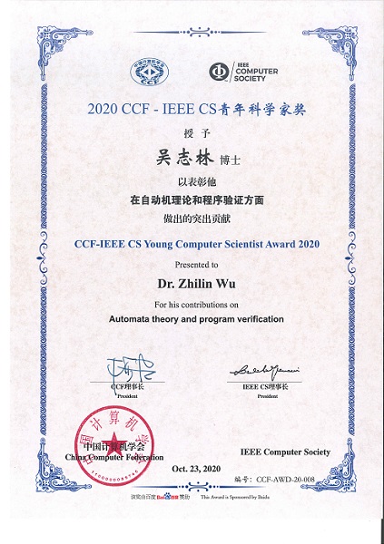 10月22日至24日,中国计算机学会(CCF)颁奖典礼在京举行。中国科学院软件研究所吴志林研究员被授予2020年“CCF-IEEE CS青年科学家奖”,表彰其在自动机理论和程序验证方面所做出的突出贡献。