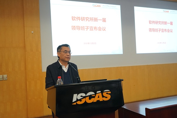 会议首先由马扬宣布中科院党组关于软件所新一届领导班子的任命: 赵琛同志任软件所所长,操云甫、钟华同志任软件所副所长,武斌同志任软件所副所长(试用期一年)。他对软件所上一届领导班子的任期工作给予了充分肯定,指出上一届领导班子党政配合、团结协作,积极贯彻新时期办院方针,扎实推进“率先行动”计划,认真组织实施“一三五”规划,在高可信软件理论和方法、天基综合信息系统技术、自然人机交互、高性能科学计算等方面取得较好成果,相关成果在国家重要基础设施和重大工程、大型企事业单位等得到应用,提供了有力的理论和关键技术支撑。在科技成果转化、党建和创新文化等方面也取得了较好成绩。研究所态势不断向好。
