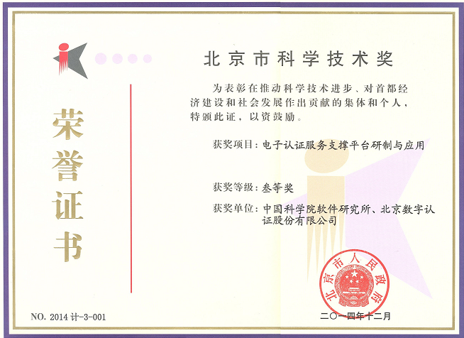 20153月,软件所可信计算与信息保障实验室主持完成的“电子认证服务支撑平台研制与应用”项目成果获得2014年度北京市科学技术奖三等奖。