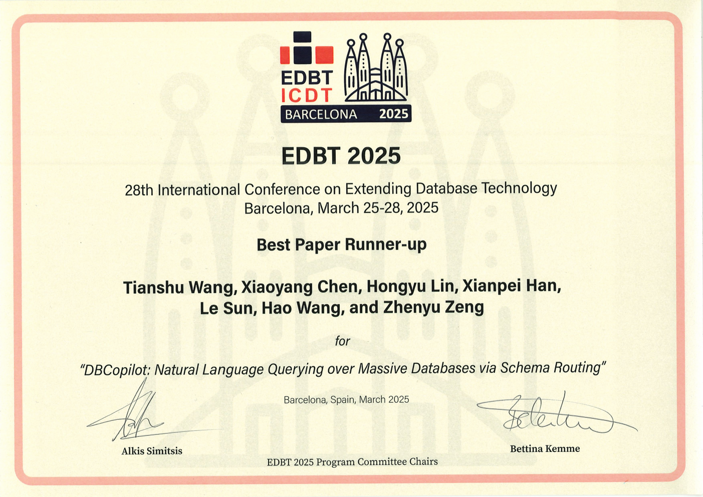 近日,数据库领域重要国际学术会议The 28th International Conference on Extending Database Technology(EDBT 2025)公布论文评选结果。中国科学院软件研究所中文信息处理实验室论文DBCopilot:Natural Language Querying over Massive Databases via Schema Routing荣获最佳研究论文奖亚军(Runner-Up for Best Research Paper Award)。论文针对海量数据库查询的扩展问题,提出了一种大小模型协作的框架——DBCopilot,通过基于关系感知的端到端模式路由,实现海量数据源的高效准确自然语言查询。第一作者为博士生王天舒,通讯作者为林鸿宇副研究员和韩先培研究员。