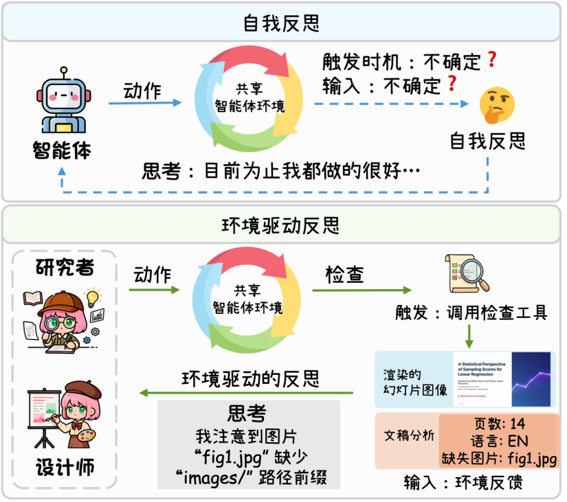 在排版优化方面,研究团队提出了环境感知反思机制(Environment-Grounded Reflection)。该机制通过"生成—渲染—审视—修正"的视觉闭环工作流,使智能体在每页幻灯片生成后,调用沙箱内浏览器将代码渲染为真实图片,并基于截图进行自适应检查与迭代优化,直至排版效果达到预期标准。