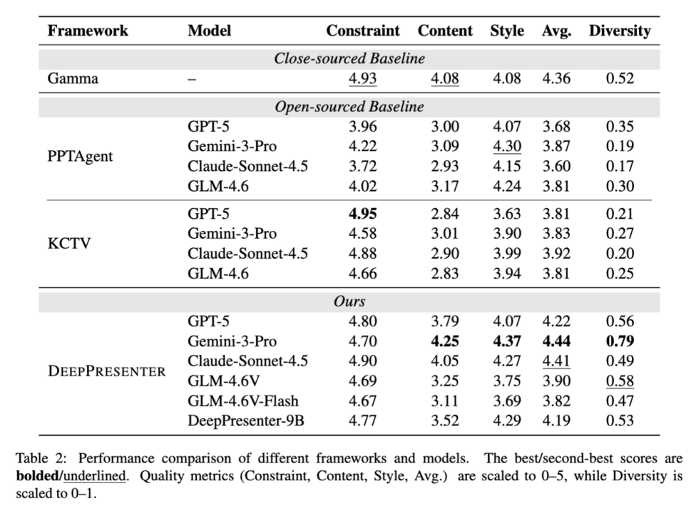 为验证所提方法的有效性,研究团队在预留的128个测试任务上使用PPTEval进行了系统评测,并与多种主流幻灯片生成方案进行了对比。结果表明,DeepPresenter(pptagent 2.0)的9B版本取得了 4.19 的综合评分,与闭源模型GPT-5(4.22)表现接近,且显著优于其他幻灯片生成方案。通过成本—性能分析,DeepPresenter-9B处于前沿曲线的最优平衡点位置,能以远低于闭源模型的算力成本实现同等级别的生成质量。所有生成内容均输出为可编辑的pptx格式,支持用户自由修改与二次创作。