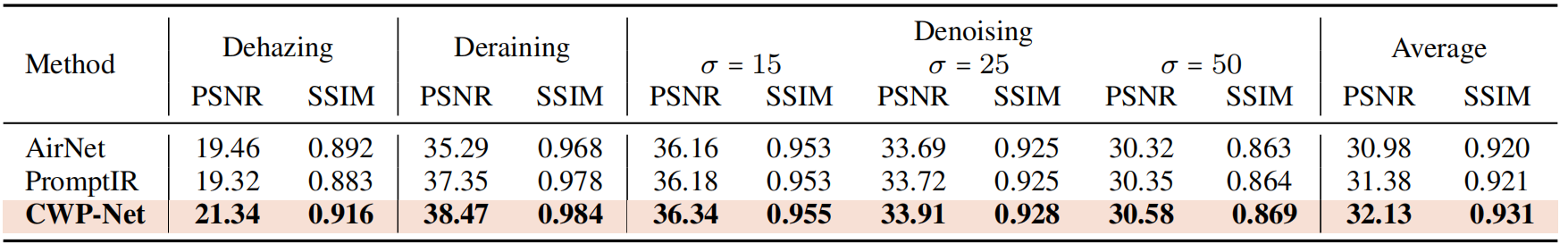 为验证方法的有效性,研究团队在多个标准图像恢复任务上开展系统评估,涵盖图像去噪、去雨、去雾、去模糊以及低照度增强等。实验结果表明,在统一图像恢复设置下,CWP-Net在多个基准数据集上均优于现有主流方法,并在平均性能指标上取得显著提升。在五种退化模式的综合评估中,CWP-Net相较现有方法平均峰值信噪比(PSNR)提升约0.59dB,去雾和去雨任务分别取得1.58 dB和1.10 dB的性能提升。此外,在均衡测试集开展的统一评估进一步验证了CWP-Net在实际场景中的优秀泛化能力。