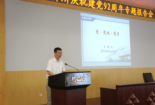 6月27日上午,软件所在5号楼四层大报告厅举行迎接建党92周年专题报告会,报告会邀请到中纪委驻院纪检组原组长、现任中科院党建工作领导小组副组长王庭大做专题报告,报告会由党委书记、副所长李玉成主持。软件所所党委委员、纪委委员、支部书记及部分党员代表、入党积极分子、非党科研骨干,共计150余人参加了报告会。