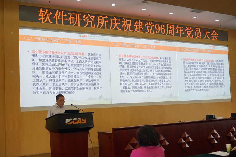 6月28日上午,在庄严的国歌声中,软件所庆祝建党96周年大会在5号楼四层大报告厅隆重举行。会议由纪委书记石兵主持,软件所党委委员、纪委委员、支部书记及支部党员等共220人参加了会议,会场气氛庄重热烈。