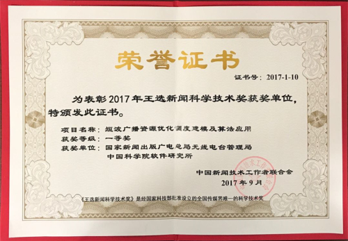 “短波广播资源优化调度建模及算法应用”项目荣获2017“王选新闻科学技术奖”一等奖