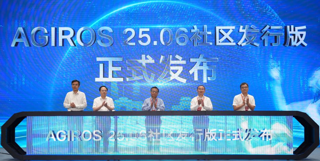 赵琛、江大勇与中科工业人工智能研究院筹备组副组长武斌、麒麟科创园管委会主任樊向前、南京市工信局副局长唐永实共同发布AGIROS 25.06社区发行版。