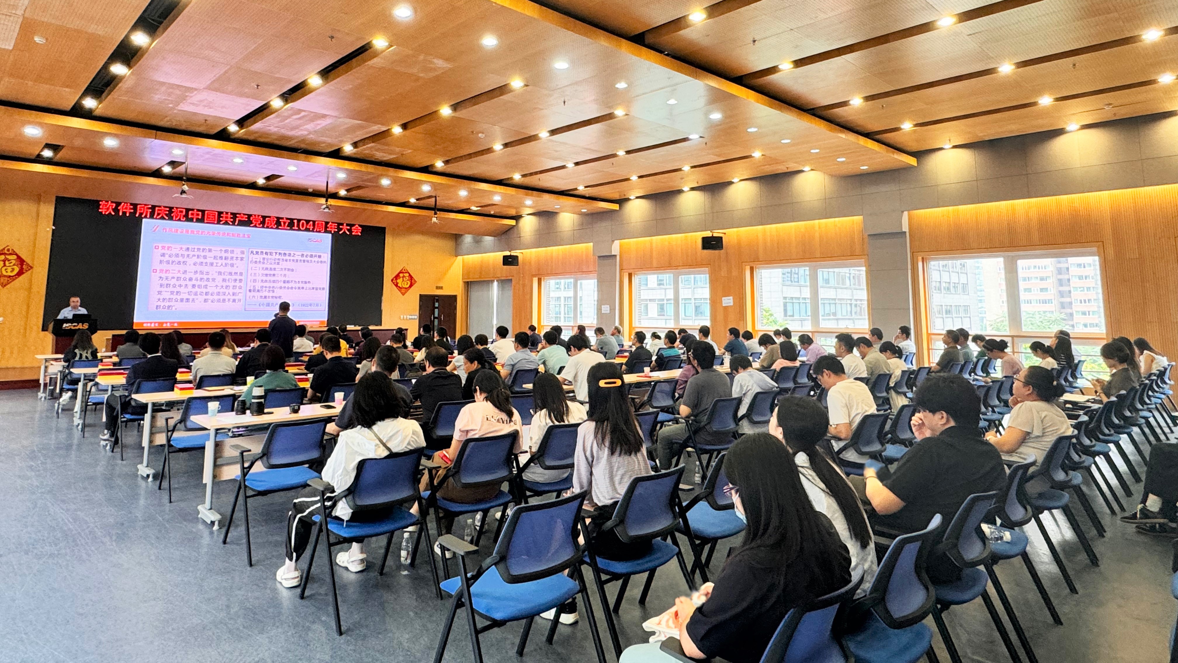 6月27日上午,软件所举行了庆祝中国共产党成立104周年大会, 会议由党委书记、副所长钟华主持,党委副书记、纪委书记李衡,党委委员、副所长田丰等120多位党员参加会议。