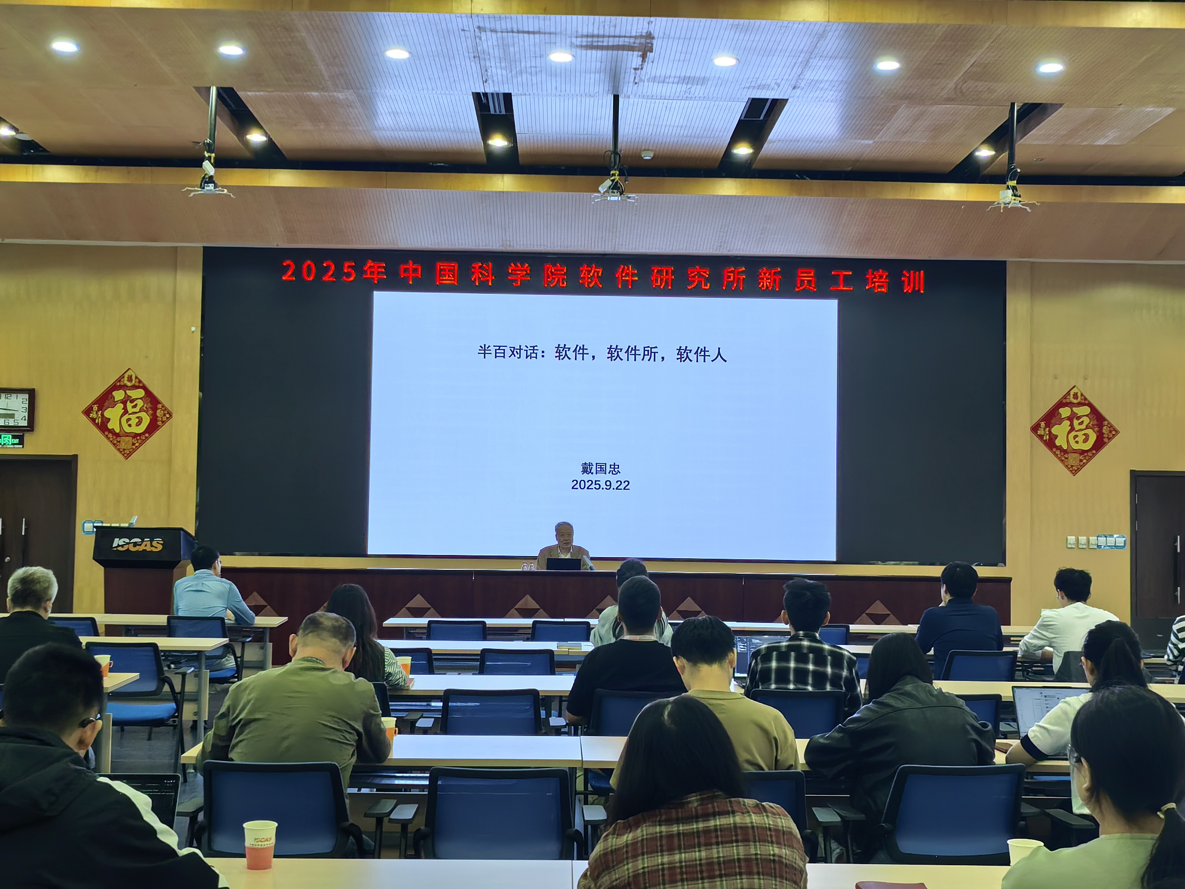 9月22日上午,软件所资深研究员、年逾八旬的戴国忠老师带来了一场精彩的特邀报告——《谈谈软件、软件所和软件人》。戴老师结合自身深厚的学术积淀与丰富的人生阅历,深情回顾了软件技术的发展历程、软件所的创立与发展足迹,以及一代代“软件人”的使命与担当。他分享了在求学与科研生涯中对科学本质与人生价值的深刻思考,其报告中所流露出的对科研事业的无限热忱、对探索未知的执着坚守以及对培养后学的无私情怀,深深感染了在场每一位新员工。