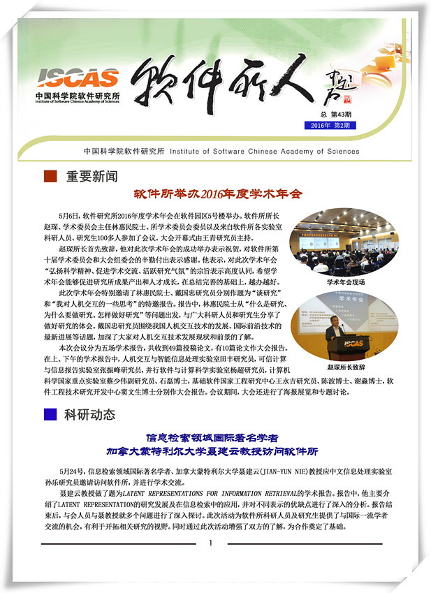 中国科学院软件研究所所刊《软件所人》2016年期刊: