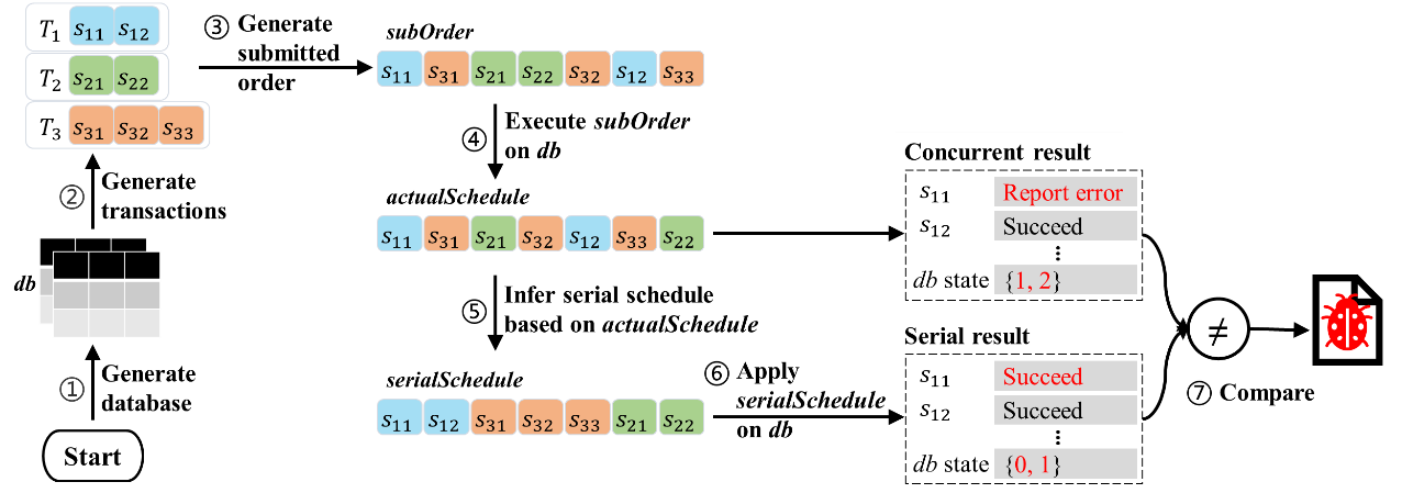 该方法以并发事务的写序列化特性为基础,即在任何隔离级别下,并发事务执行与特定序列化事务执行产生相同的数据库状态,从而依据并发事务执行调度来推断特定写序列化的调度。当实际事务执行的数据库状态与特定序列化事务执行产生的数据库状态不一致,则表明存在事务缺陷。研究团队通过WriteCheck在六个关系型数据库系统(MySQL、PostgreSQL、SQLite、MariaDB、CockroachDB、TiDB)中,发现了22个特定写序列化违背,其中11个是尚未被披露的新事务缺陷。
