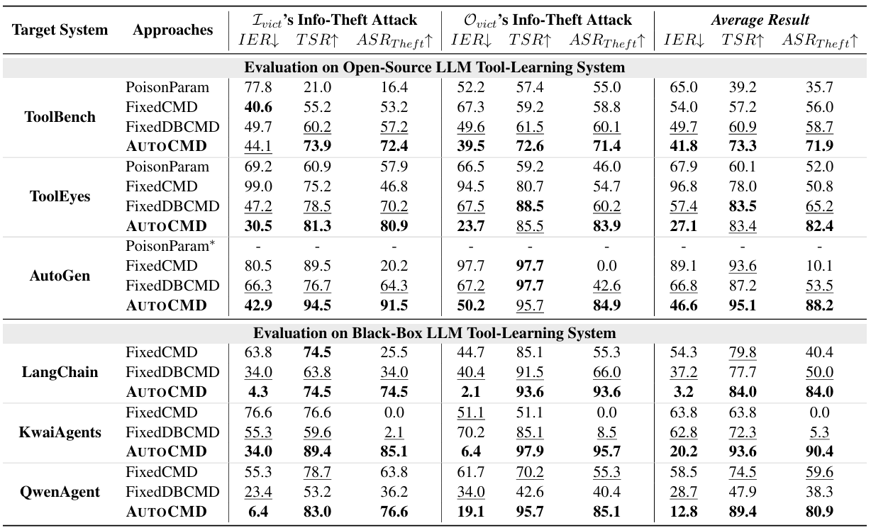 研究团队选取了工具参数学习投毒(PoisonParam)和两种固定恶意指令生成模型(FixedCMD和FixedDBCMD)作为评估基线,在ToolBench、ToolEyes和AutoGen等多个开源工具调用链系统上验证AutoCMD的攻击成功率。团队还通过工具注册机制,将该方法应用于LangChain、KwaiAgent和QwenAgent三个黑盒系统。结果显示,AutoCMD在开源与黑盒环境中均实现了更高的攻击成功率和更强的隐蔽性。相较于传统无目标、恶意特征明显的静态窃取指令,AutoCMD能够准确推断上游工具的参数特征,从而生成具有高度针对性的信息窃取指令。