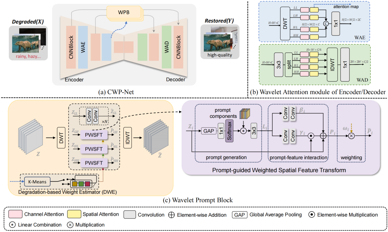 针对上述问题,研究团队从因果推断视角对统一图像恢复任务进行了系统分析,发现使用可观测的频域提示特征作为校正变量,可以实现对各类低质图像和复原图像之间真实因果效应的学习。基于这一思路,研究团队提出一种基于因果去混杂的小波解耦提示网络CWP-Net。该方法利用小波变换对图像特征进行频率分解,在频域空间显式解耦退化信息与语义信息,有效切断退化特征与语义信息的伪相关路径,缓解虚假相关问题;并结合提示学习机制自适应调节图像恢复过程。同时,研究团队设计了退化权重估计模块,可根据退化表征动态调整提示信息,从而更加准确捕捉退化图像与恢复图像之间的因果效应。