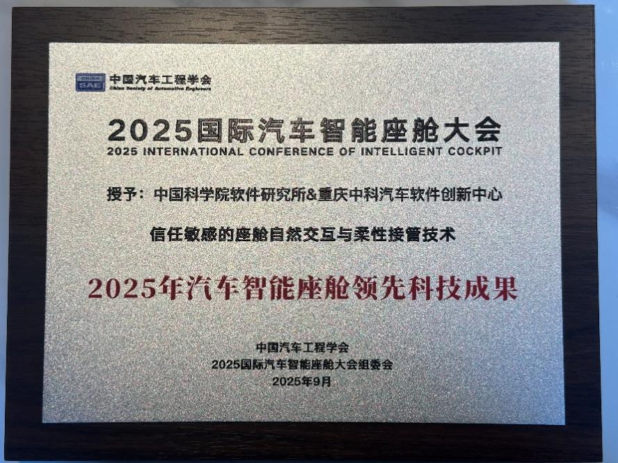 9月16日,在中国汽车工程学会和江苏省科学技术协会共同主办的国际汽车智能座舱大会上,中国科学院软件研究所与重庆中科汽车软件创新中心联合研发的“信任敏感的座舱自然交互与柔性接管技术”,荣获2025汽车智能座舱领先科技成果奖。软件所主要完成人为人机交互技术与智能信息处理实验室王宏安研究员、李清坤助理研究员、马翠霞研究员、姚乃明高级工程师、郭雯丽工程师和博士生章程。